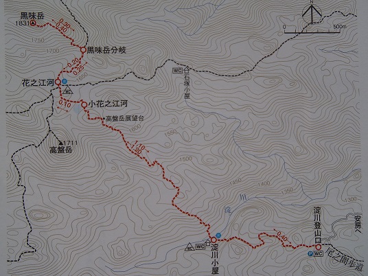 淀川から黒味岳までは約3時間の登りですがガイドが案内すると、3,30-4時間ぐらいかけて頂上に行きます。